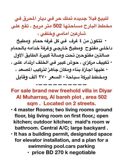 اكتشف فرصة ملحوظة لامتلاك فيلا واسعة تقع على جزيرة أمواج في محافظة المحرق. تحتوي هذه العقار على أربع غرف نوم مجهزة بشكل جيد وستة حمامات، مما يوفر مساحة كافية للعائلات أو لأولئك الذين يستمتعون باستضافة الضيوف. تتميز الفيلا بمساحة كبيرة تبلغ 502 متر مربع، مما يضمن لك الكثير من المساحة لجعلها منزلك المثالي.